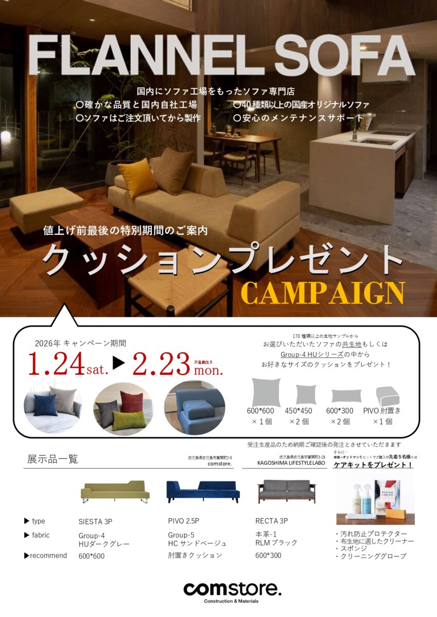 【価格改定前ラストチャンス】FLANNEL SOFAクッションプレゼントキャンペーンのお知らせ
